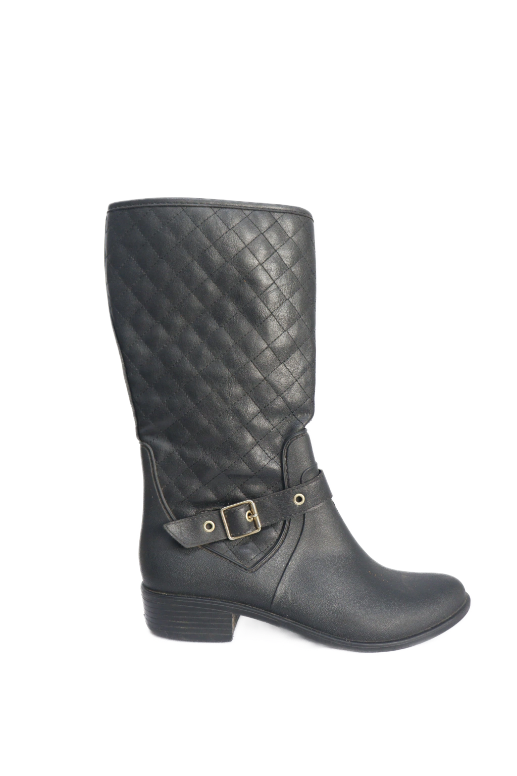 Modelagem: A bota com salto e cano médio possui fivela laterale e zíper para fechamento. Courino texturizado.