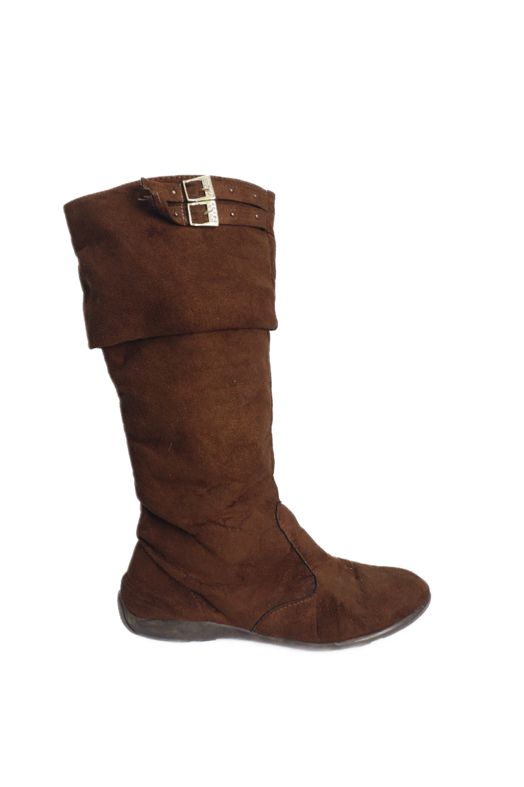 Modelagem: A bota em camurça cano médio, possui fivela dourada e zíper.