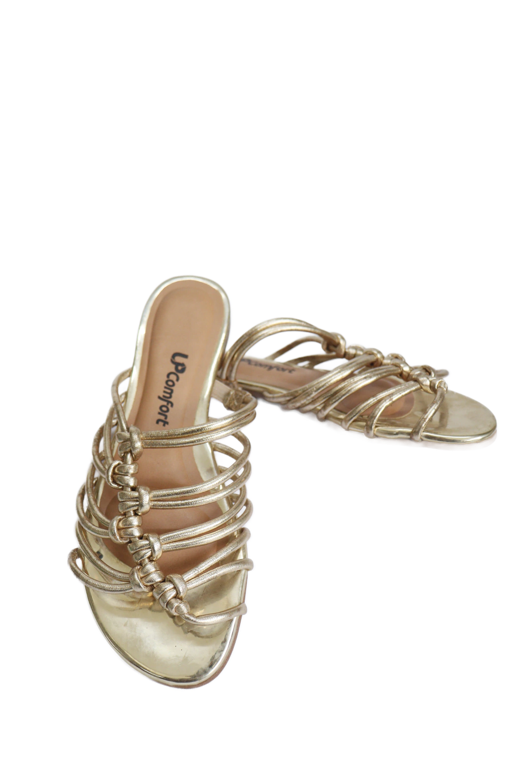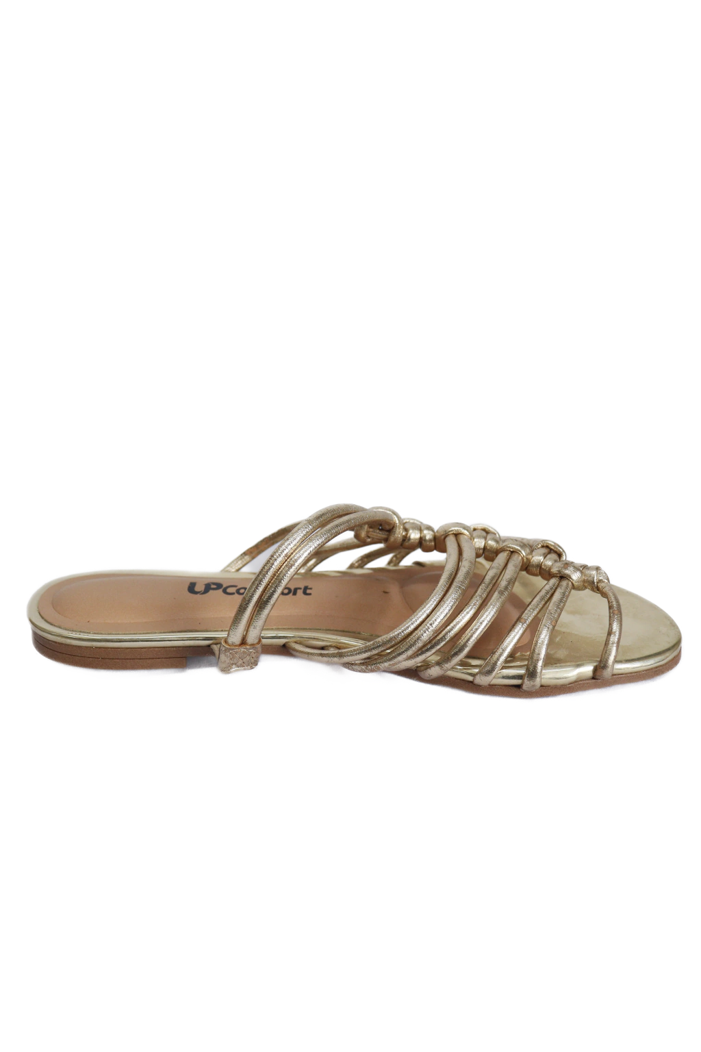 Modelagem: A sandália metalizada é ideal para um visual sutil e delicado, sem salto. A correia é ajustável, palmilha acolchoada, aplicação de fivela dourada para fechamento lateral. Solado de borracha antiderrapante.